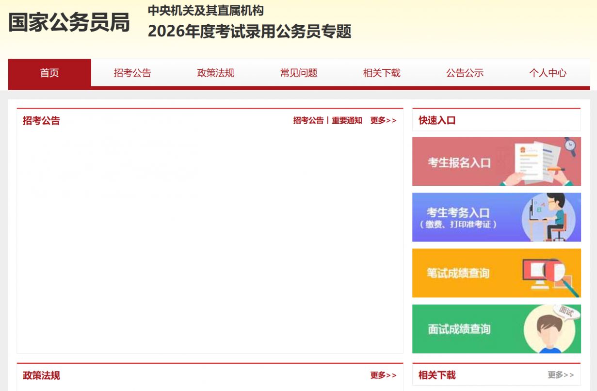 中央机关及其直属机构2026年度考试录用公务员专题网址是:http://bm.scs.gov.cn/pp/gkweb/core/web/ui/business/home/gkhome.html