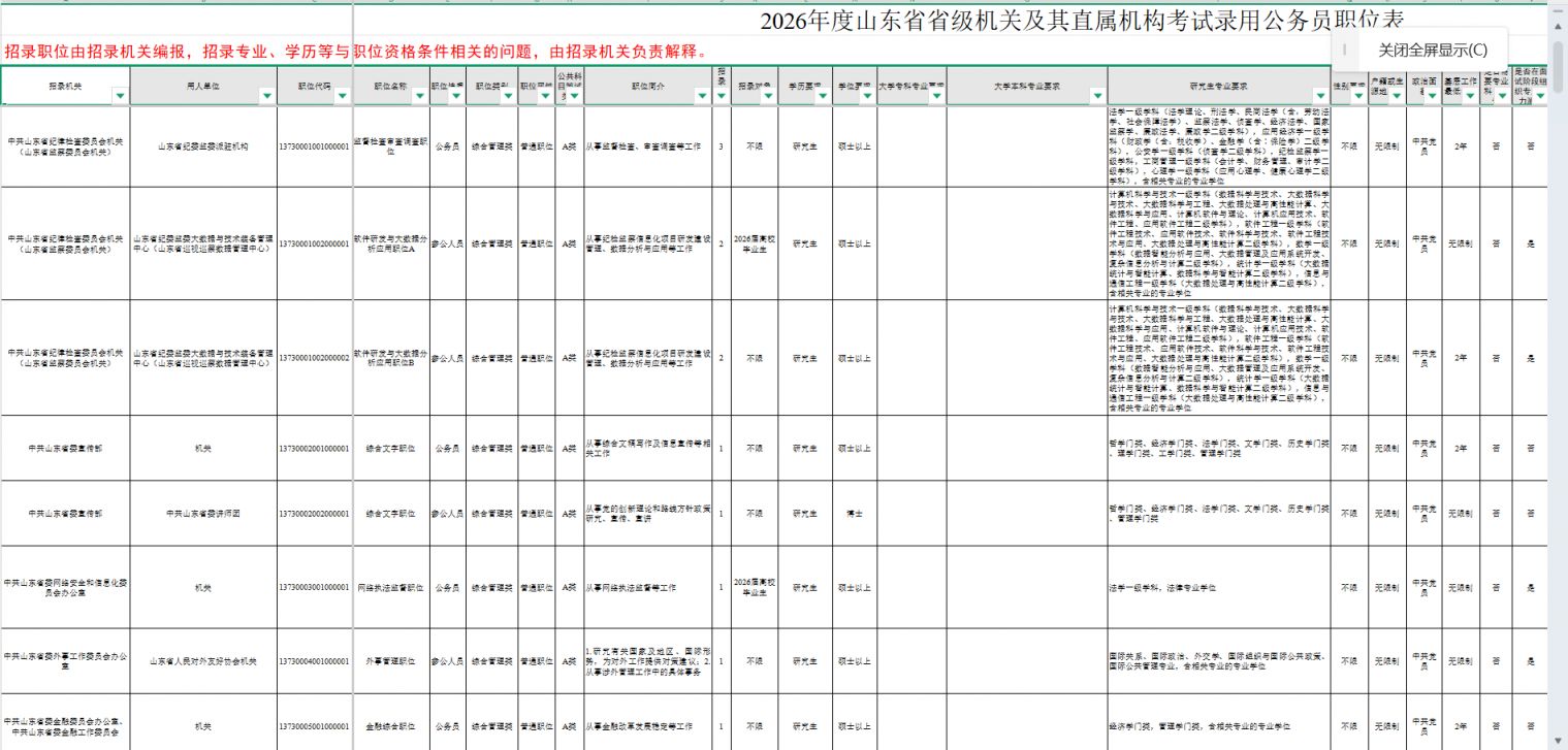 2026山东省考岗位表查询(完整版):2026年度山东省省级机关及其直属机构考试录用公务员职位表